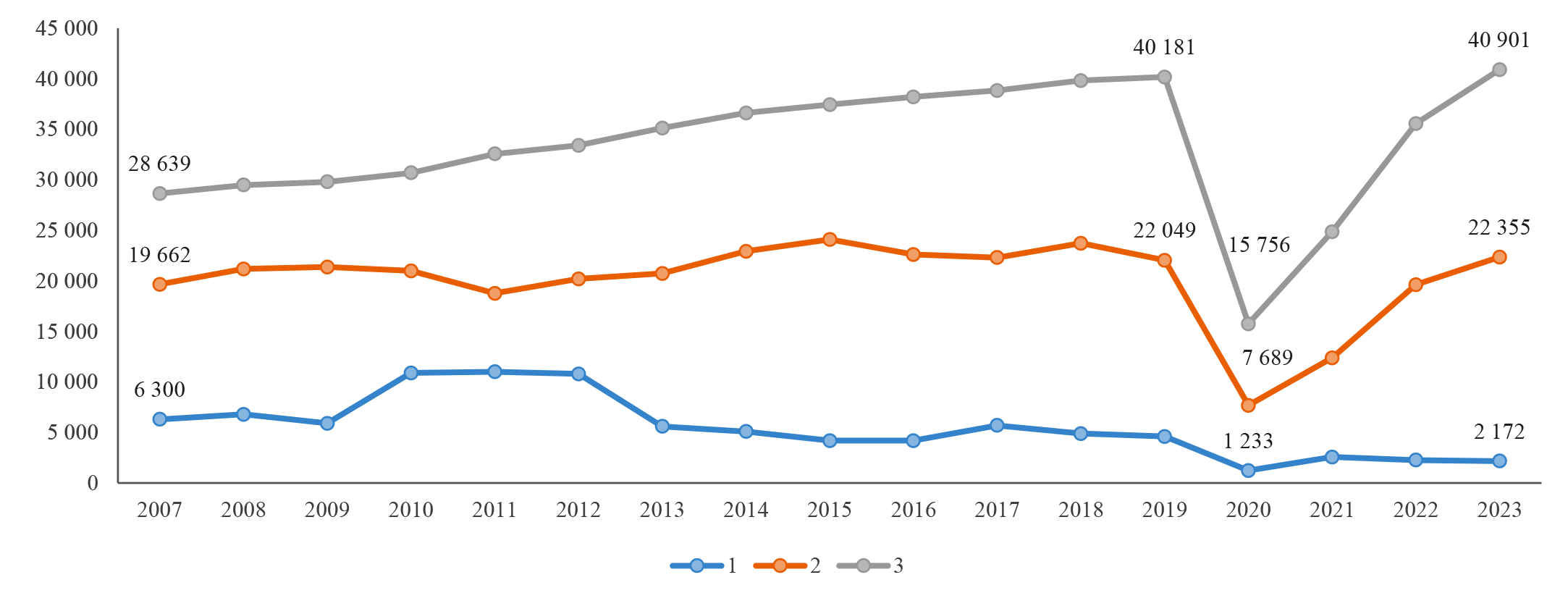 Рисунок. Численность зрителей, тыс. чел.: 1 – на цирковых представлениях; 2 – на мероприятиях, проводимых концертными организациями и самостоятельными коллективами Минкультуры России; 3 – на мероприятиях, проводимых театрами Минкультуры России (значение показателя за год)23