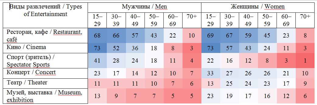 Results. The most popular types of entertainment: visiting restaurants/cafes (48 %) and cinemas (37 %). Gender and age differences are significant: young people more often choose movies (73 %), women choose theaters (21 %), men prevail among spectators at sporting events (24 %). Urban residents are more actively involved in cultural life (go to theaters, museums) compared to the rural population. Regional differences are pronounced: Chukotka (62 % of cinema attendance) and St. Petersburg (33 % of theater attendance) represent extreme values.