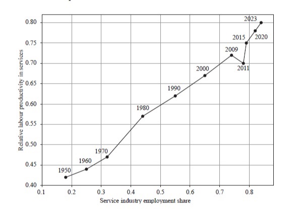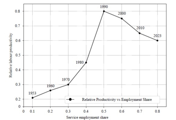 Comparison of different types of economies. Desirable service industry productivity measurements lead to structural changes within industrial systems. Fig. 2 (UK) and Fig. 3 (Japan) and Fig. 4 (Argentina) depict yearly modifications in service industry employment ratios along with staff productivity in relation to other sectors within the selected nations. These statistical data present various patterns of service sector development based on country classification. Japan together with the UK shows productive service sector improvement and increasing employment rates but Argentina experiences no such growth while its service industry employs more people. Structural transformation along with digital technology adoption offers a greater advantage to countries with higher economic status compared to nations with lower profits.