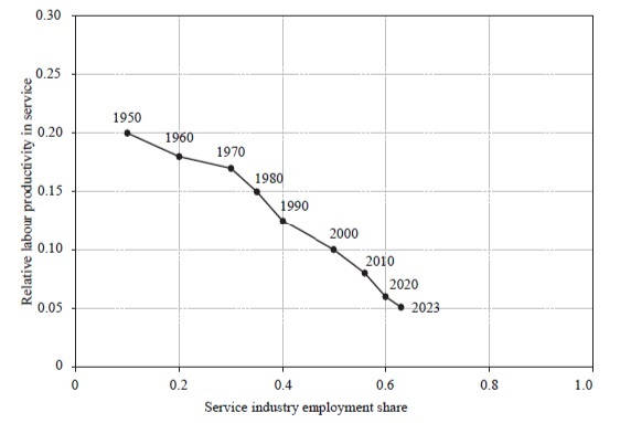 Grishina et al. examined annual changes in employment share and relative labor productivity of service industry in typical countries, revealing distinct patterns of sectoral development [3]. Note: 1) Based on data from ten industry sectors from the Groningen Growth and Development Centre (GGDC); 2) The values next to the lines in the figure, such as “1950”, represent the years.