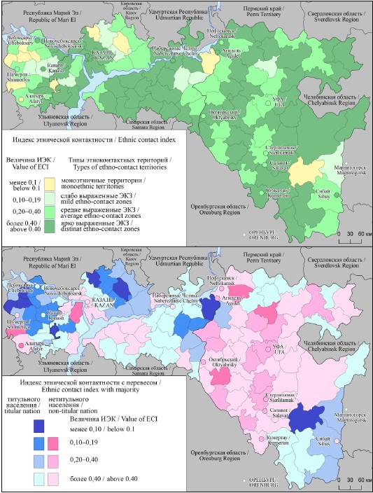 Ярко выраженные ЭКЗ между титульным и нетитульным населением занимают большую часть территорий республик, и встречается лишь несколько «островков» моноэтничных территорий с титульным населением и «вкраплений» со значительным перевесом нетитульного населения (слабо выраженные ЭКЗ). Наиболее обширные территории с перевесом нетитульного населения в ярко выраженных ЭКЗ покрывают Республику Башкортостан (кроме ее южной части) и центральную часть Республики Татарстан. В целом же в Татарстане в большей степени представлены ярко выраженные ЭКЗ с минимальным перевесом титульного населения. Наиболее крупные «островки» со значительным перевесом титульных народов (моноэтничные территории и слабо выраженные ЭКЗ) сконцентрированы в Чувашской Республике (в северной части) и Республике Татарстан (в северной и восточной частях). В южной части Республики Башкортостан, кроме одного моноэтничного района, имеется также группа районов с заметным перевесом титульного населения, рассматриваемых как слабо и средне выраженные ЭКЗ.
