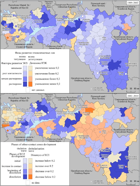 В последнем десятилетии ХХ в. тюркские республики Урало-Поволжья, кроме Чувашии, испытали волну титулизации населения. Предложенная в статье методика определения фаз развития этноконтактных зон позволила выявить в этот период два основных типа динамики ЭКЗ в регионе исследования: 1) начальные фазы развития ЭКЗ с ростом доли титульного народа; 2) начало растворения ЭКЗ в пользу титульного населения.