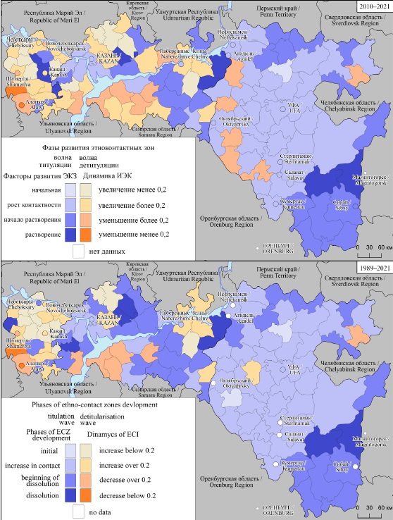 Во втором десятилетии XXI в. в муниципальных образованиях Башкортостана почти повторилась этническая динамика, характерная для 90-х гг. ХХ в. Однако в Татарстане и Чувашии пространственная динамика этнических процессов определялась в большей мере детитулизацией населения, в связи с чем расширились территории, где началось растворение ЭКЗ в пользу нетитульного населения.