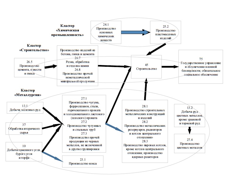 Главным потребителем отрасли «Производство цемента, извести и гипса» (26.5) является отрасль «Производство изделий из бетона, гипса и цемента» (26.6), «Резка, обработка и отделка камня» (26.7), «Производство прочей неметаллической минеральной продукции» (26.8). Замыкает цепочку взаимосвязи отрасль «Государственное управление и обеспечение военной безопасности; обязательное социальное обеспечение» (75), которая является главным потребителем отрасли «Строительство» (45). Выявленные восходящие и нисходящие связи между отраслями говорят о наличии кластера «Строительство» (рис. 4).