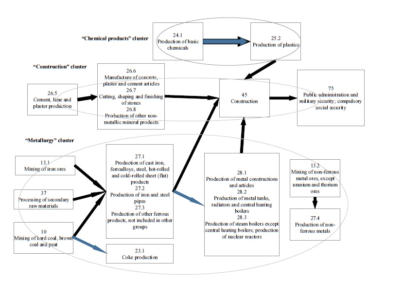 Анализируя нисходящие и восходящие связи полученных графов (рис. 4), можно сказать, что «Добыча каменного угля, бурого угля и торфа» (10) – главный поставщик для отрасли «Производство кокса» (23.1). Для отраслей «Производство строительных металлических конструкций и изделий» (28.1), «Производство металлических резервуаров, радиаторов и котлов центрального отопления» (28.2), «Производство паровых котлов, кроме котлов центрального отопления; производство ядерных реакторов» (28.3) главным поставщиком материалов является группа отраслей «Производство чугуна, ферросплавов, стали, горячекатаного проката и холоднокатаного листового (плоского) проката» (27.1), «Производство чугунных и стальных труб» (27.2), «Производство прочей продукции из черных металлов, не включенной в другие группировки» (27.3). Отрасль «Производство цветных металлов» (27.4) является главным потребителем отрасли «Добыча руд цветных металлов, кроме урановой и ториевой руд» (13.2). Вышеперечисленную группу отраслей можно отнести к кластеру «Металлургия» (рис. 4).