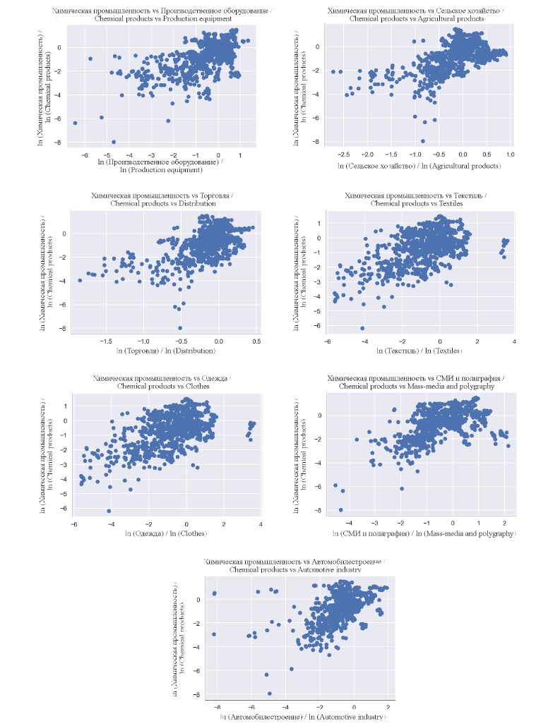 Таким образом, если рассматривать полученный результат корреляционного анализа по шкале Чеддока, то со значения коэффициента корреляции, равного 0,5, корреляция считается заметной. В таком случае можно говорить о том, что кластер «Химическая промышленность» связан и локализован в одних регионах с такими кластерами, как «Производственное оборудование» (0,61), «Сельское хозяйство» (0,59), «Торговля» (0,58), «Текстиль» (0,55), «Одежда» (0,55), «СМИ и полиграфия» (0,53), «Автомобилестроение» (0,49). Также для визуализации результатов представлены графики рассеивания логарифмированных коэффициентов локализации данных кластеров с «Химической промышленностью» (рис. 7).