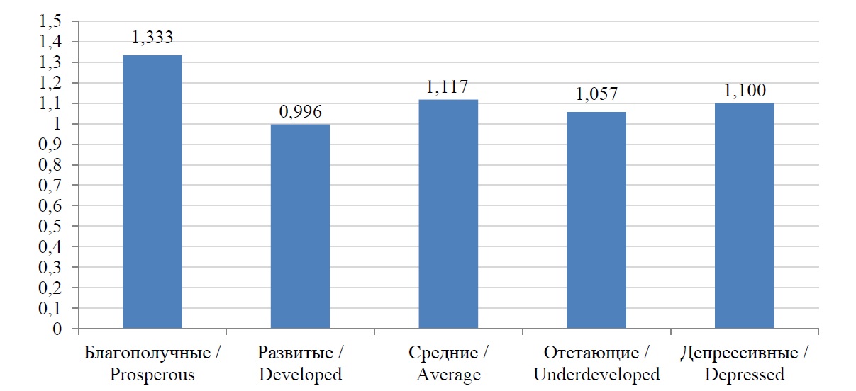 Также можно сделать предположение, что по причине наличия возможностей использования трудовых ресурсов на развитых территориях не уделяется должного внимания формированию человеческого капитала. Взаимосвязь может заключаться в том, что муниципальные образования, отнесенные к группе развитых, являются более экономически благополучными, соответственно, обладают большими возможностями применения труда. В этом случае жители, проживающие в менее богатых территориях, в поисках работы или большего дохода переезжают в развитые муниципалитеты. Исходя из этого, в развитых муниципалитетах снижается необходимость интенсивного развития качества человеческого капитала, так как трудовые возможности данных территорий выступают объектами миграционного притяжения населения, формирование человеческого капитала которого может осуществляться отстающими и депрессивными территориями.