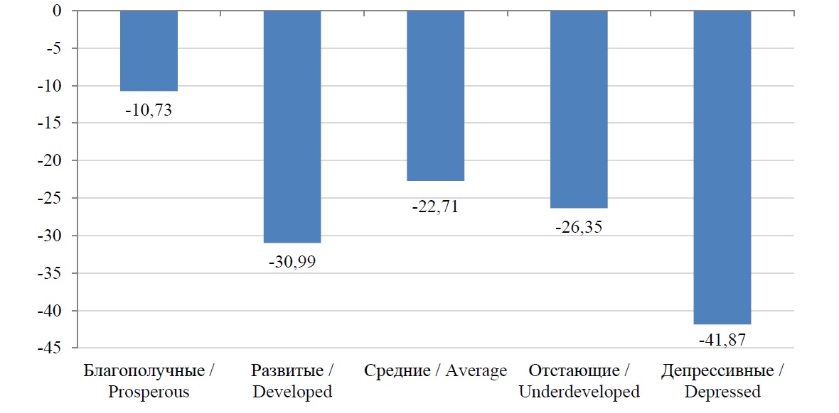 Вследствие расчета изменений экономического индекса за период с 2012 г. было выявлено, что в муниципалитетах всех групп социально-экономического положения произошло его снижение (рис. 2). При общем снижении только у регионального центра Пермского края улучшились значения экономического индекса (на 20 %), чему в том числе могла поспособствовать высокая степень централизации учреждений воспроизводства человеческого капитала, а также более благоприятное социально-экономическое состояние Перми по сравнению с другими муниципальными образованиями региона. Таким образом, снижение экономического индекса произошло также и на всех остальных благополучных территориях.