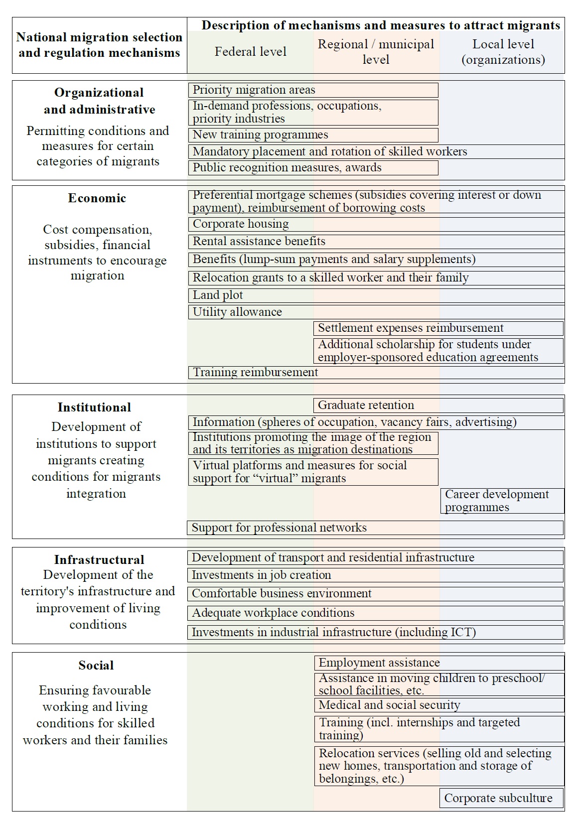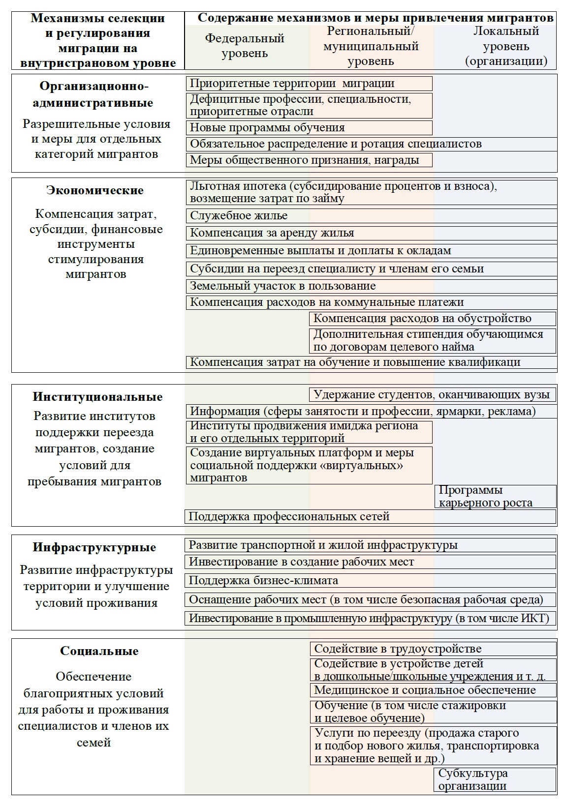 Наиболее проработанными и часто используемыми механизмами являются следующие: ограничения и преференции при получении разрешительных документов на въезд, пребывание/проживание и осуществление трудовой деятельности, устанавливаемые, как правило, для иностранных трудящихся-мигрантов6, предоставление жилья (льготные условия найма жилья и ипотеки, земельные участки и др.) [22; 23], доплаты и подъемные на переезд, консьерж-сервис, сборы для нежелательной миграции (для работодателя или работника), информационное сопровождение и поддержка, продвижение (информационные порталы и сервисы, деятельность мигрантских сообществ, диаспор и диаспоральных организаций, таргетная реклама, кампании, информирующие о приоритетных сферах занятости для мигрантов, ярмарки) [24; 25].