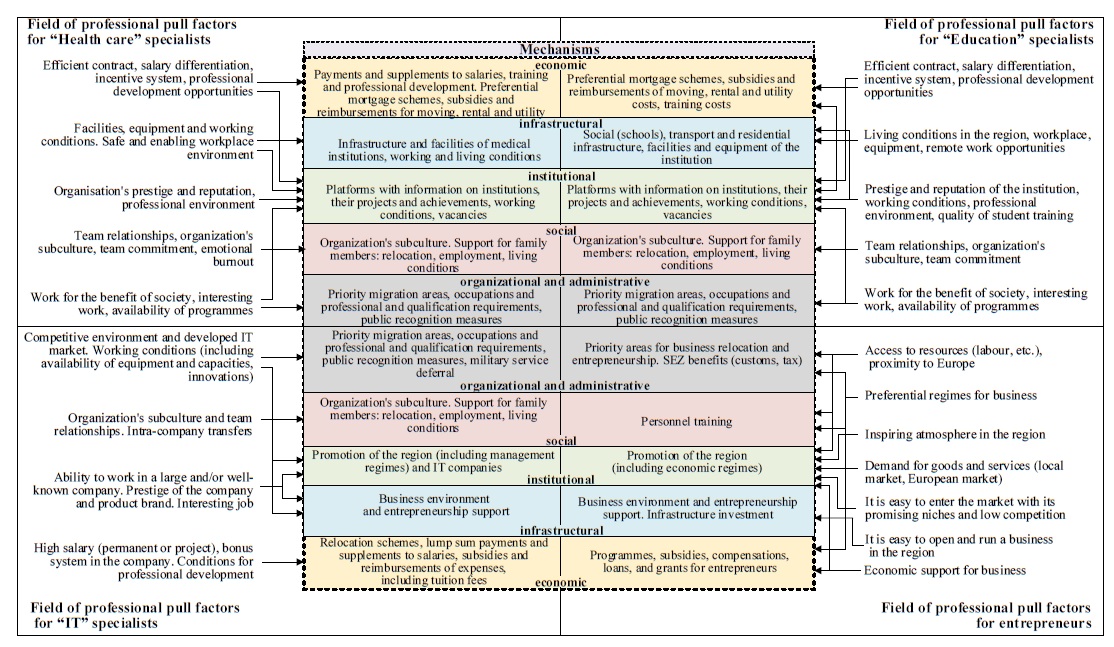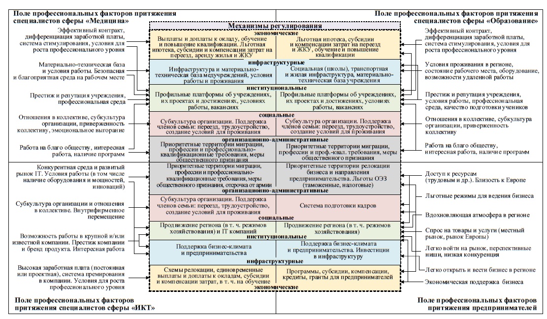 Калининградская область активно вовлечена в реализацию ряда обозначенных выше федеральных программ («Земский доктор», «Земский фельдшер», «Земский учитель»), но действует и региональная Программа повышения мобильности кадров, отдельные меры для поддержки работников сферы медицины, образования, бизнеса и ИКТ. Системно они обозначены на рисунке 2 в сопоставлении с профессиональными факторами миграции. В качестве основного критерия в выборе профессиональных факторов притяжения по целевым группам принималось во внимание: 1) насколько они учитываются в уже представленных механизмах регулирования; 2) насколько значимо их влияние с точки зрения мотивации специалистов к профессиональной мобильности по результатам проведенного авторами статьи социологического исследования и более ранних работ.