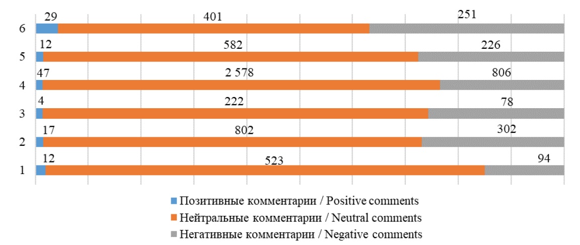 Большинство комментариев нейтральны («Новокузнецк ОНЛАЙН» и «Администрация города Новокузнецка»), лидером концентрации негативных оценок выступают ресурсы «Подслушано Новокузнецк» (302 комментария) и «Администрация города Новокузнецка» (806 комментариев). Рост нейтральных комментариев (высокое присутствие такого рода оценок на фоне остальных) позволяет поддержать идею актуальности данных инноваций, а также коридор, который население (пользователи) готовы использовать для демонстрации себя и «своих» интересов быстро и безболезненно.