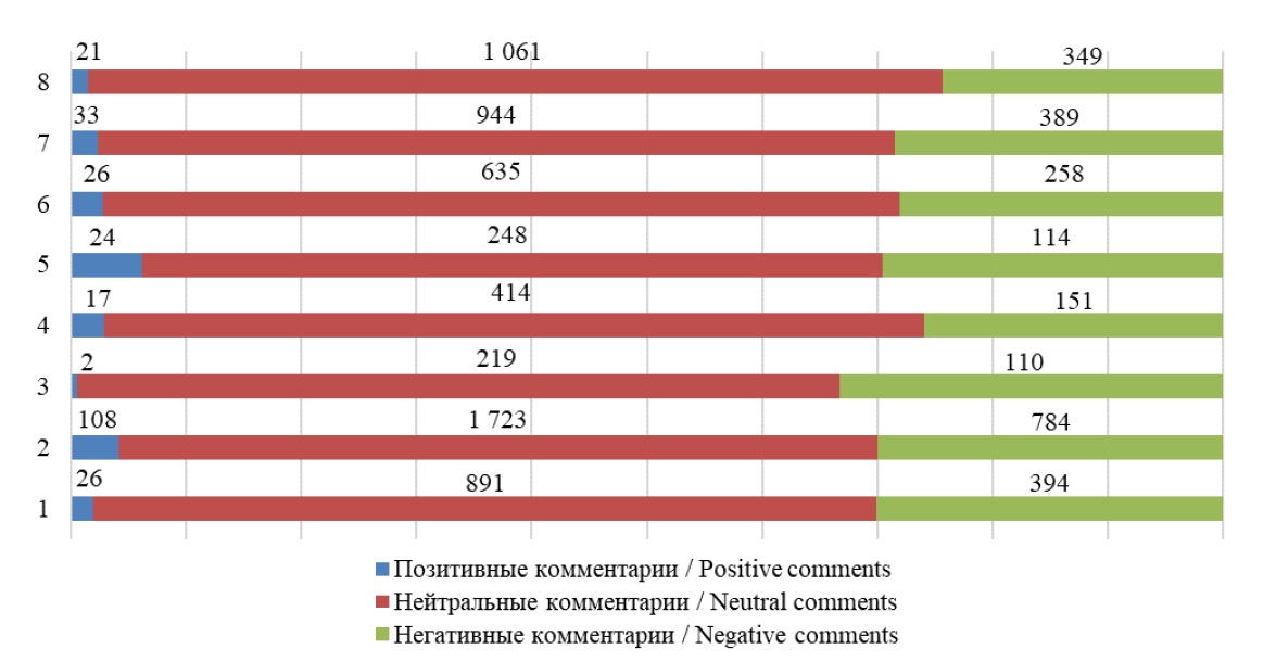 Fig. 2. Analysis of public comments and speeches on the pages of communities in social networks about the transport reform (the number and nature of comments on Kemerovo (June 2018 – February 2022))