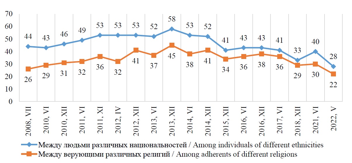 Доля граждан, отмечающих отсутствие в отношении себя дискриминации по признаку национальной, языковой или религиозной принадлежности, оставалась в последние годы на одном уровне: в 2016 г. – 82 %; 2020 г. – 84, 2022 г. – 83,7 %. В 2022 г. тренд позитивной оценки состояния межнациональных отношений в России сохранялся.