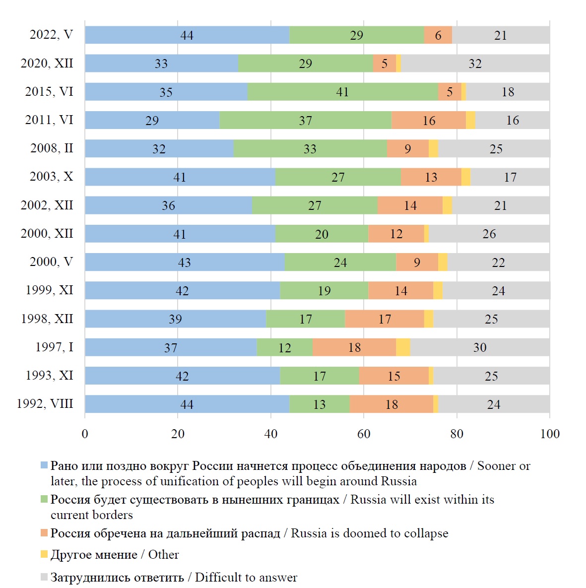 Геополитическое будущее России в оценках населения. Главными экзистенциальными угрозами в постсоветский период в России сначала стали не только региональный национализм и этносепаратизм, проявивший себя в начале 1990-х гг., но и актуализация «русского вопроса», который в ряде случаев был выражен максимой «Россия для русских»7. Ответом на дезинтеграционные процессы стала попытка сформулировать основные положения общегражданской объединительной идеологии на основе общероссийской идентичности и отчасти социалистического ресентимента с апелляцией к позитивному опыту советского прошлого [18]. В ходе мировоззренческих поисков был сформулирован концепт «Русского мира»8, который постулирует уникальность российской цивилизации и рассматривается как своеобразный инструмент мягкой силы и обеспечения политического суверенитета России [8; 19].