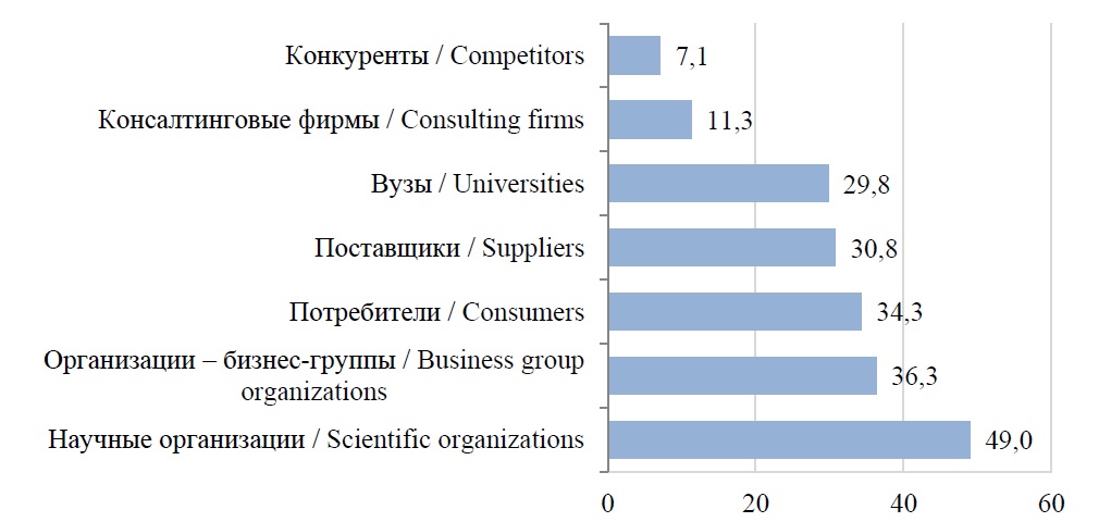 Исходя из данных таблицы 1, прослеживается тенденция снижения доли организаций, участвующих в совместных проектах по выполнению исследований и разработок, приобретение и продажа новых технологий также снижается. На фоне этого интересным фактом является значительное увеличение числа совместных проектов, что может быть связано с тем, что организации, имеющие успешный опыт кооперации, увеличивают количество проектов, что подтверждается данными о типах кооперационных связей. Партнеры по кооперации представлены на рисунке 1.