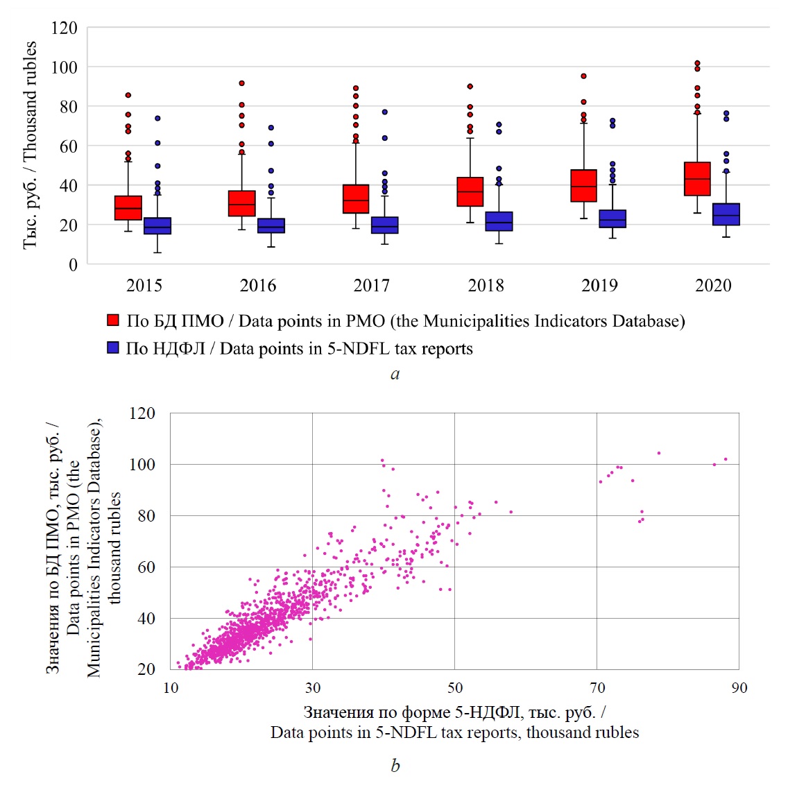a) сравнение абсолютных значений; b) диаграмма рассеивания за 2015-2020 гг.