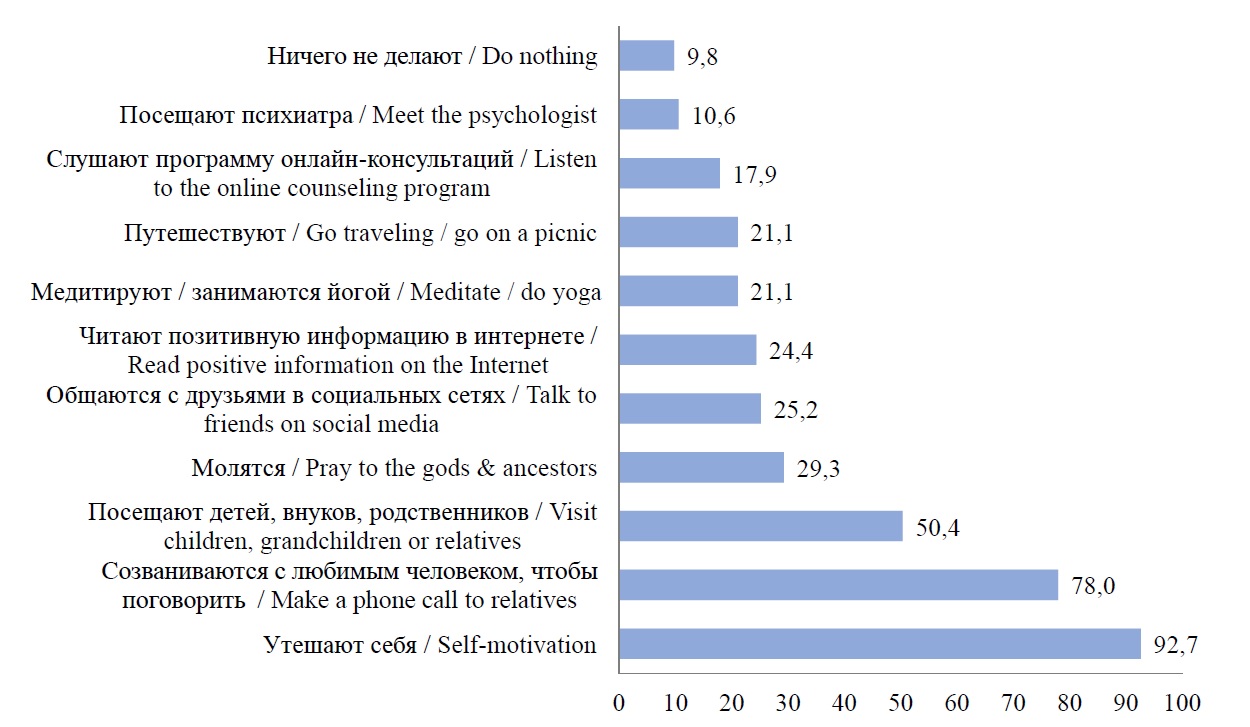 Негативные настроения возникают непосредственно в цифровом мире, поэтому для их решения пожилые люди склонны комбинировать решения в реальной жизни (посещение детей и родственников (50,4 %), путешествие (21,1 %), обращение к религии или национальным традициям (29,3 %)) и в цифровой сфере (общаются с друзьями в интернете, в социальных сетях (29,3 %), читают оптимистичную информацию в Сети (24,4 %)).