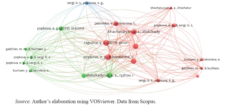 From Figure 4, the most co-cited studies (in the red cluster) are not actually directly focussed on regional entrepreneurship. They include works by Ragulina [28] and Popkova & Parakhina [29], and Abdulkadyrov et al. [30]. Leading studies in other clusters include Popkova et al. [31] and Sergi5.