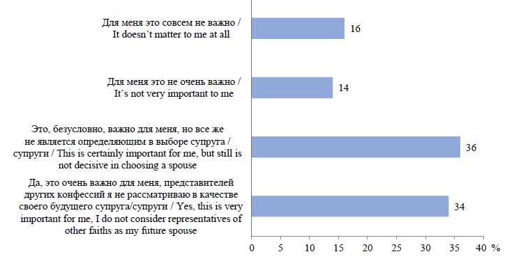 Несмотря на то, что ислам более категоричен в возможности выбора брачного партнера по отношению к женщинам, статистически значимых различий в ответах между не состоящими в браке мужчинами и женщинами на вопрос «Для Вас важно, чтобы будущая жена/муж были с Вами представителями одной веры?» не наблюдалось. В то же время для большинства респондентов это важный фактор в выборе брачного партнера (рис. 3). Гендерных различий в данном вопросе для уже состоящих в браке респондентов также не наблюдалось: доля тех, чей супруг/супруга оказались немусульманами, была приблизительно одинаковой как для мужчин, так и для женщин, но в целом доля тех, чей супруг(а) были мусульманами, была значительно выше (78 % против 22 %).