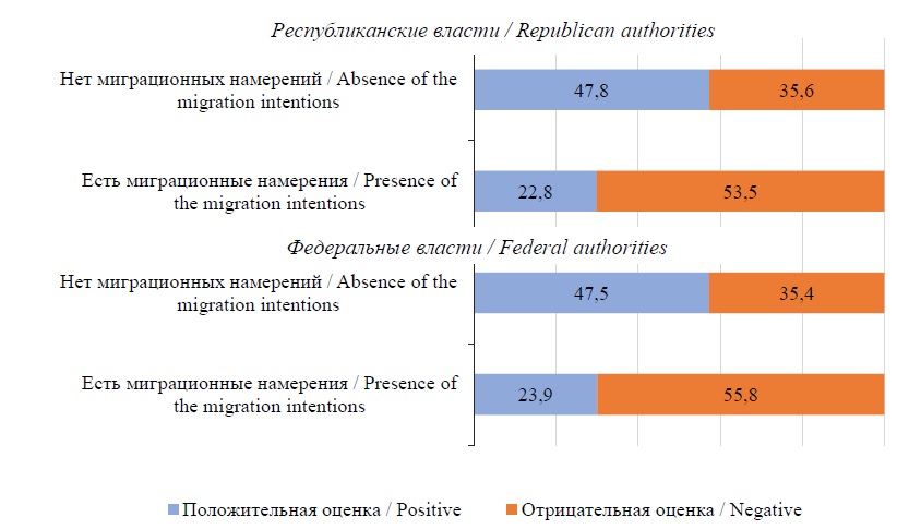 Миграционные намерения и оценка деятельности власти находятся в обратной зависимости, респонденты, настроенные на миграцию, менее позитивно оценивают деятельность как республиканских, так и федеральных органов власти. Опрошенные с высоким потенциалом миграционной мобильности полагают, что власти к населению относятся с недоверием.