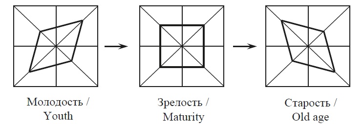 Длина вектора | | = 0 достигается, когда геометрическими образами профиля организационной культуры является квадрат или ромб. Такие состояния организационной культуры можно считать равновесными, так как, следуя определению общекультурного вектора, они обладают максимальным адаптационным потенциалом к внешним воздействиями, следовательно, обеспечивают устойчивое развитие. Как показано ранее в нашей статье, если сопоставлять адаптационный потенциал площади четырехугольника, то профилем истинного равновесного состояния организационной культуры является квадрат [37]. Возможные ромбы соответствуют квазиравновесным состояниям. В целом «жизненный цикл» организационной культуры можно представить следующей цепочкой квазиравновесных и равновесного состояний (рис. 2).