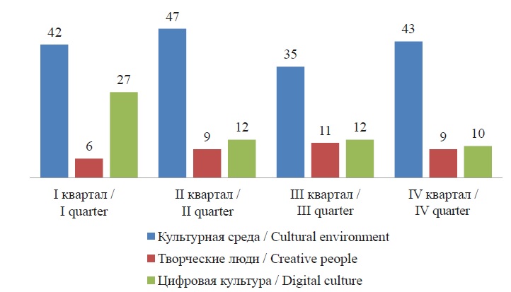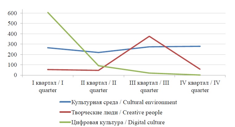 Квартальная динамика обсуждения национального проекта в СМИ показала, что общественная оценка в отношении проектов «Цифровая культура» и «Творческие люди» была неоднозначной. Если в начале года их реализация вызывала пристальный интерес, то затем на протяжении всего года отличалась общественным вниманием «Культурная среда». Пик интереса к программе «Творческие люди» пришелся на III квартал, но IV квартал ознаменовался резким спадом (рис. 2). Заинтересованность населения к новостям республиканских СМИ о ходе реализации национального проекта «Культура» во многом зависела от внешних обстоятельств, в том числе связанных с эпидемиологической ситуацией.