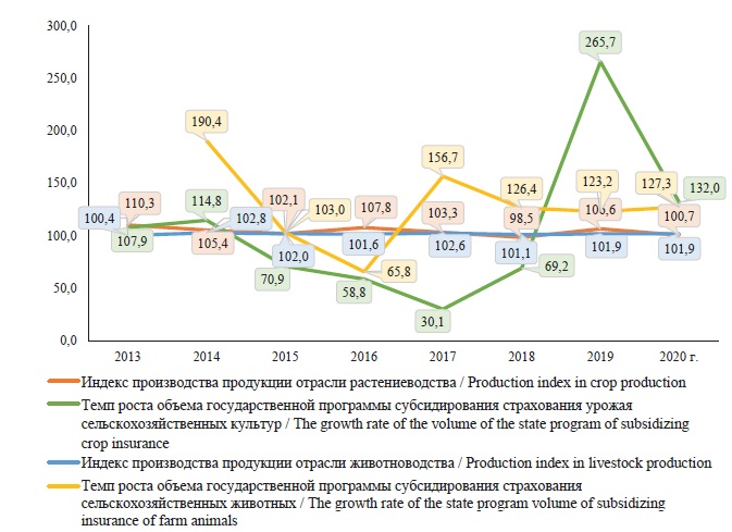 Данные рисунка 1 демонстрируют отсутствие четкой связи между изменениями индекса сельскохозяйственной продукции отраслей растениеводства и животноводства и темпом роста субсидирования сельскохозяйственного страхования.