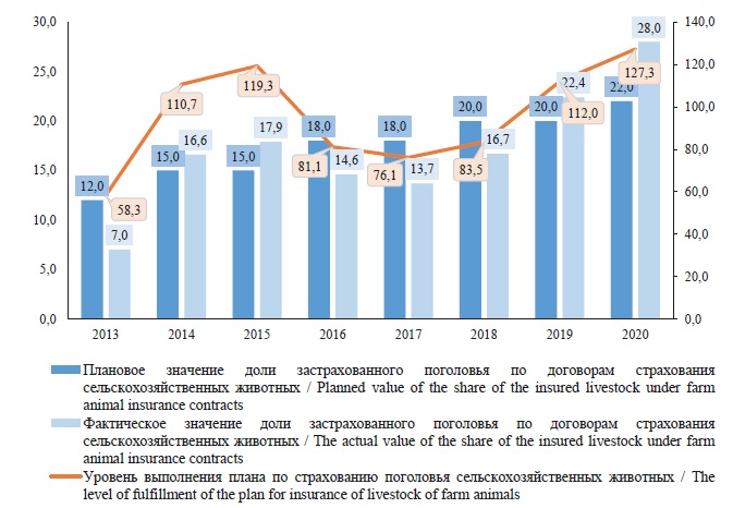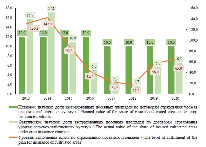 Показатели свидетельствуют о значительном перевыполнении плановых значений застрахованных посевных площадей по договорам страхования в растениеводстве в 2013–2014 гг. на уровне 130,8 и 142,5 % соответственно. В 2015 г. наблюдалось недовыполнение плана на 9,2 %. В годы реализации единого субсидирования (2016–2018 гг.) объем застрахованных посевных площадей динамично сокращался, что влекло за собой невыполнение даже заниженных плановых показателей вплоть до 17,0 % в 2018 г. В 2019 г. после реформирования единой субсидии началось восстановление сельскохозяйственного страхования и план был выполнен на 56,0 %. В 2020 г. положительная тенденция продолжилась: выполнение плана по доли застрахованных посевных площадей составило 65,0 %.