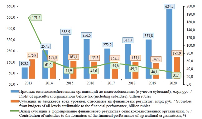 Суммарно объем прибыли, полученной сельскохозяйственными организациями за 2013–2020 гг., составил 2 670,4 млрд руб., из них 48,6 % (1 297,8 млрд руб.) были сформированы за счет государственных субсидий, относимых на финансовый результат.