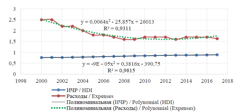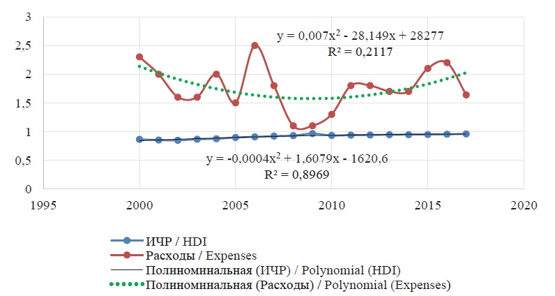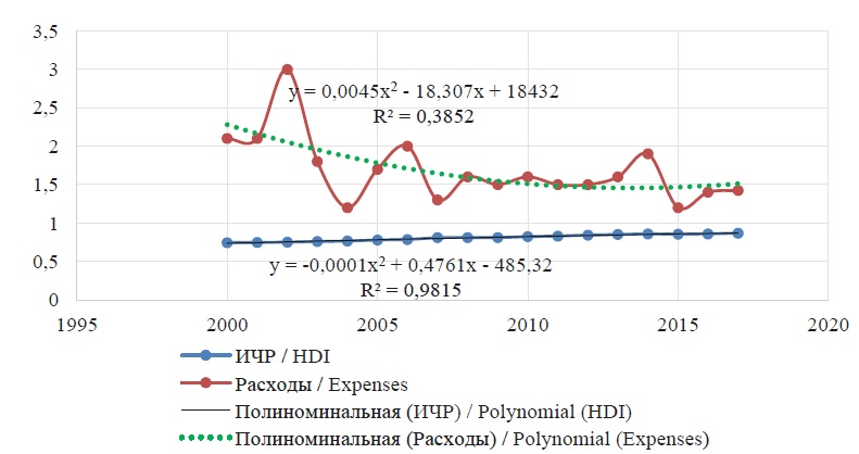 Discussion and Conclusion. The data obtained indicate a steady downward trend in the share of expenses on the purchase of alcoholic beverages against the backdrop of a steady increase in the human development index in 2000–2017. The materials of the paper can be used to monitor and adjust the approaches of the state authorities to the directions of reducing the degradation of human capital from the consumption of addictive goods in troubled regions.