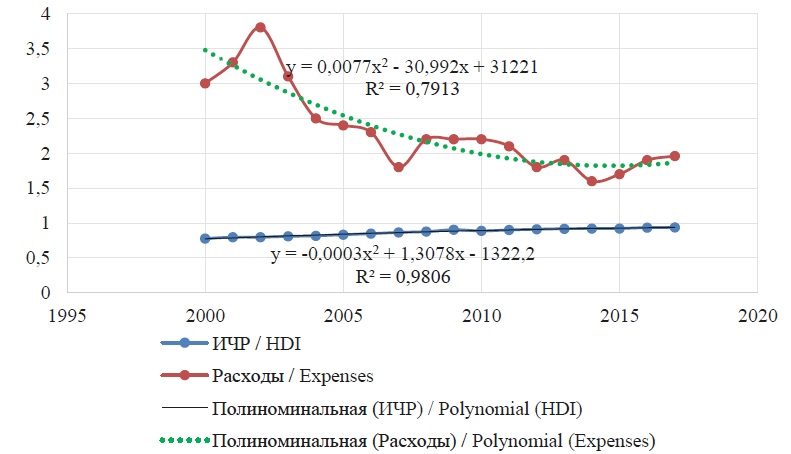 Результаты статистического анализа взаимосвязи доли расходов на алкогольные напитки в расходах на конечное потребление домашних хозяйств, а также ИЧР в регионах России за 2000–2017 гг. изложены в приложении 13. Коэффициенты детерминации рассчитаны с использованием построенных трендовых моделей ИЧР и расходов для России в целом и всех субъектов. Примеры графических моделей для типичных регионов Российской Федерации показаны на рисунках 1–4.