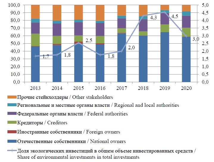 Results. The results of the study showed that the companies of the studied territory are characterized by a low volume of environmental investments, but it is higher than the national average. The direction and strength of the influence of individual stakeholders on investing in environmental protection is differentiated by environmental areas. At the same time, all the identified groups of stakeholders have a positive, albeit different, impact on the level of investment in environmental protection in all areas in the aggregate. To the greatest extent, the current volume of environmental investments is because of the interests of corporate creditors and federal authorities, to the least – owners, especially foreign ones.