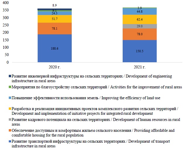 На 2020 г. на обеспечение комплексного развития сельских территорий суммарно было предусмотрено (согласно заключенным соглашениям) 28,9 млрд руб. (в 2021 г. – 27,4 млрд руб. (табл. 2)), из которых 22,7 млрд руб., или 78,6 %, – это средства/субсидии федерального бюджета (в 2021 г. – 24,4 млрд руб., или 89,2 %), а 6,2 млрд руб., или 21,4 %, – средства бюджетов субъектов Федерации (в 2021 г. – 3,0 млрд руб., или 10,8 %). В разрезе финансирования направлений комплексного развития сельских территорий наибольшая доля в 2021 г. была предусмотрена на реализацию мероприятий по развитию инфраструктуры сельских территорий (порядка 92,6 % от общего объема средств федерального бюджета и бюджетов субъектов Федерации; на создание условий для обеспечения доступным и комфортным жильем сельского населения – 7,0 %, на развитие рынка труда (кадрового потенциала) на сельских территориях – 0,4 %. По данным Министерства сельского хозяйства Российской Федерации, в 2020 г. в целом по стране освоено 98,6 % средств федерального бюджета и 98,9 % средств бюджета субъектов Федерации (от лимита), предусмотренных на обеспечение комплексного развития сельских территорий); в 2021 г. – 95,3 и 98,4 % соответственно.