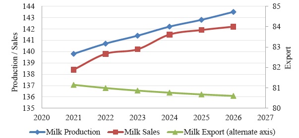 Milk sales in the Stavropol Territory from 2021 to 2026 will increase from 138.4 to 142.2 thousand tons, that is, there will be an increase of 3.8 thousand tons or 2.7%.