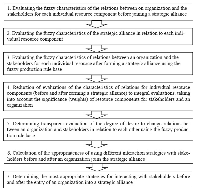 Materials and Methods. The proposed method is based on a fuzzy model of choosing strategies for the interaction of an organization with stakeholders before and after the entry into the alliance. The quantitative values of the relationship characteristics within the model framework are estimated for each resource component participating in the resource exchange of stakeholders with the organization, using a base of fuzzy production rules and a fuzzy inference algorithm.