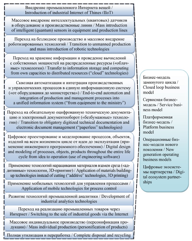 К числу приоритетных и наиболее актуальных технологических инструментов Индустрии 4.0 для цифровой трансформации деятельности промышленных компаний можно отнести: искусственный интеллект, квантовые и суперкомпьютерные технологии, технологии идентификации и сквозной обработки информации, блокчейн и нейронные сети, киберфизические системы (CPS), 3D-технологии и аддитивное производство, технологии Big Data, роботизацию и робототехнику, беспилотные технологии, биометрические разработки, мобильные технологии и др.11.