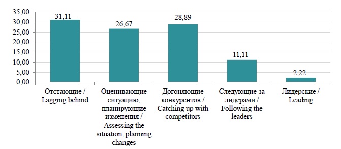 Позицию своего предприятия в процессах цифровой трансформации 2,2 % респондентов охарактеризовали как лидерскую, 11,1 % – посчитали свои предприятия отстающими (рис. 3). Основная доля (31,1 %) опрошенных предприятий отнесена к категории догоняющих, внедряющих то, что уже есть у большинства конкурентов. Довольно большой процент – это предприятия, следующие за лидерами, внедряющие новейшие достижения (28,9 %), и предприятия, которые оценивают ситуацию, планируют изменения (26,7 %).
