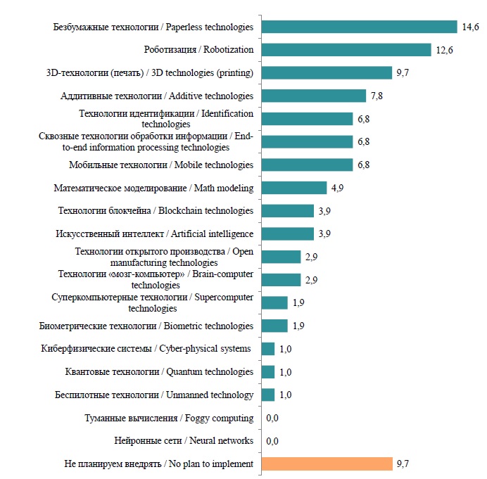 При этом опрос показал, что, по мнению большинства (более 40 %) респондентов, неиспользование искусственного интеллекта, суперкомпьютерных и квантовых технологий, туманных вычислений, технологий идентификации, блокчейна, нейронных сетей, роботизации, киберфизических систем, 3D- и аддитивных технологий, открытого производства, безбумажных и других современных цифровых технологий в области работы с данными, производства и взаимодействия с окружающей средой не оказывает значительного влияния на текущий уровень конкурентоспособности обследованных предприятий.