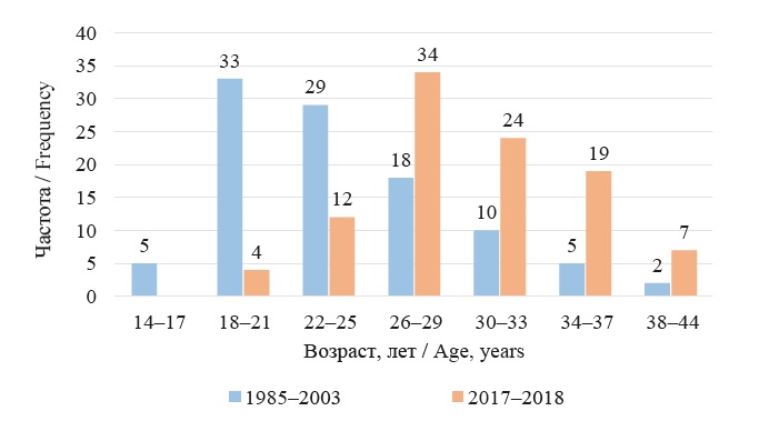 Распределения женщин-рожениц по возрасту в двух городах России представлены в таблице 2, из которой видно, что между ними нет статистически достоверных различий: 55 % женщин в выборках из Тюмени и Петропавловска-Камчатского рожают детей в возрасте от 26 до 33 лет. В предыдущий временной период, на рубеже ХХ и ХХI вв. (1985–2003 гг.), самую многочисленную группу представляют женщины в возрасте 18‒25 лет (62 %). Доля женщин, которые становятся матерями в 26–33-летнем возрасте в два раза меньше, чем в 2017–2018 гг., меньше и женщин старшего возраста ‒ 38–44 лет (рис. 3). Средний возраст рожениц в двух городах в исследуемый период времени одинаков: 30,1 ± 0,63 – в Тюмени, 29,5 ± 0,38 – в Петропавловске-Камчатском.