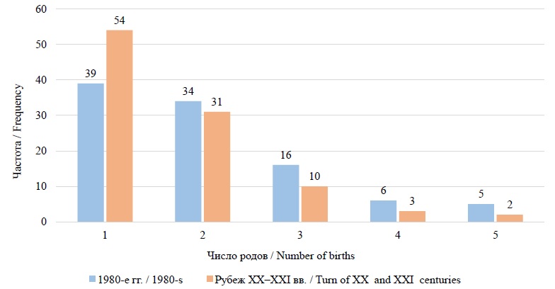 Results. The authors have determine that the distribution of women by age at the birth of children is the same in two Russian cities. A group of women aged 26 to 33 years is represented with 55% frequency. The average age of women in labor from two cities is the same. In Tyumen is 30.1 ± 0.63, in Petropavlovsk-Kamchatsky is 29.5 ± 0.38. The article provides evidence that in the previous period, the proportion of women in labor aged 18 to 25 years was 60%. In both cities, the distribution of women by the number of births is the same, 83% gave birth twice. 14% of children were born in third births. In the previous time interval, 65% of children were born in first birth. During this period it has been defined that the average number of births in the city of Tyumen is less than in the rural areas of the south of the Tyumen region, and less than among the indigenous women in the north of the region (Khanty and Mansi).