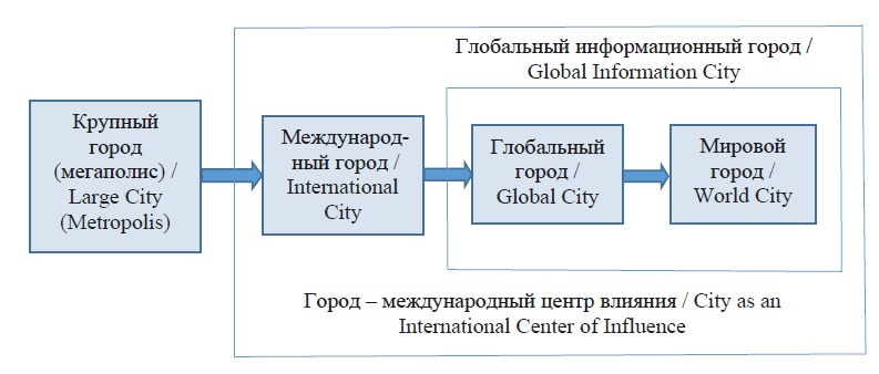 Различные исследовательские концепции рассматривают ключевые понятия, которые характеризуют и акцентируют внимание на нескольких категориях мегаполисов, тем или иным образом вовлеченных в глобальные международные процессы: «мировой город», «глобальный город», «международный город», «информационный город». По нашему мнению, данные категории городов не являются синонимичными, а имеют определенные ключевые различия. Так, концепция мирового города акцентирует внимание на ведущем значении и политическом влиянии в мире ограниченного числа мировых центров, имеющих важное историческое значение, мощный экономический, финансовый, политический, культурный вес в мире. Концепция глобального города рассматривает города мира через призму наличия в них филиалов высокоспециализированных сервисных транснациональных компаний, безотносительно исторического значения, численности населения, политического влияния. Данным концепциям противопоставляется концепция международного города, акцентирующая внимание на комплексном характере международной деятельности крупных городов-миллионеров, не делая акцент на иерархичности этих процессов. Концепция информационного города говорит о трансформации в глобальных городах пространства мест в пространство потоков и роли данных городов в качестве информационных центров и центров цифровых технологий в мире.