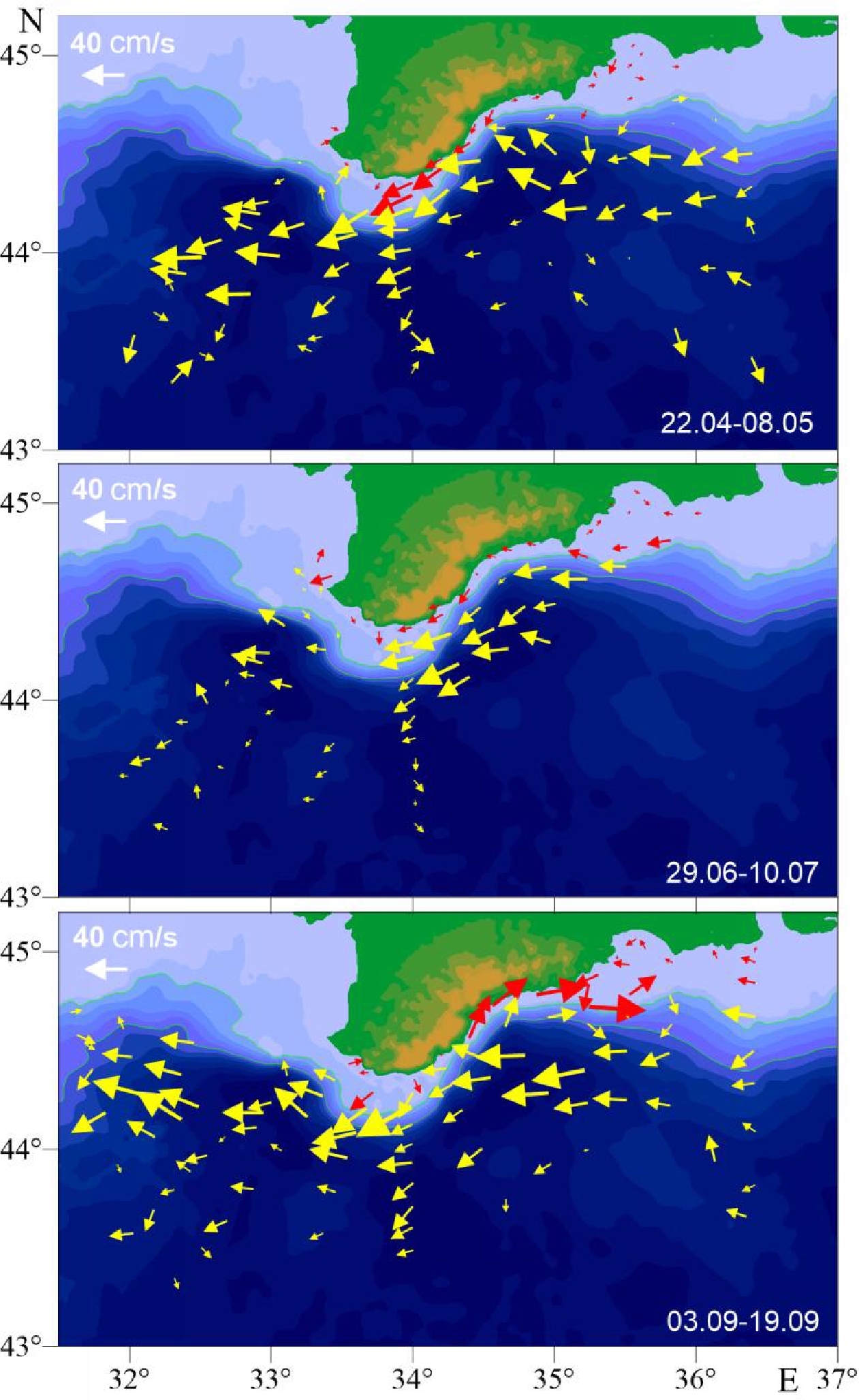 In the spring expedition, the horizontal distribution of currents revealed an anticyclonic mesoscale eddy (the Crimean anticyclone) with the typical scale of ~40 km in the eastern part of the polygon. In the autumn expedition, a powerful alongshore current at a velocity of up to 40 cm/s was observed by the Southern coast of Crimea in the nearshore shelf zone. It was moving in the direction opposite the intense Rim Current (30–40 cm/s) and maintained its direction throughout the whole water column.