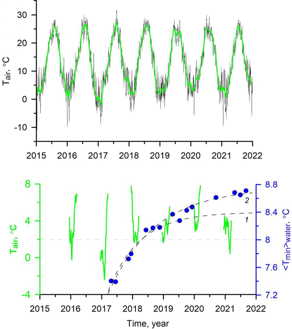 Accordingly, the decrease in the temperature of the CIL waters and their renewal were not observed. Dashed line 1 shows the earlier proposed relationship [5], according to which the temperature of the CIL increases after its renewal in 2017. The approximating function has the following form: null, where t – time period, year. Taking into account the new data of expeditionary measurements, the updated relationship is as follows (dashed line 2): null.