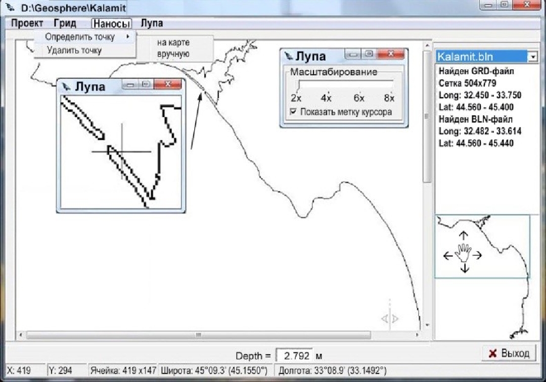 In this case, depth arrays of varying granularity and coastline detail covering the study area are used as initial data. Taking into account the characteristics of the source data, the information structures presented by Golden Software, an American company, in the form of contour files (BLN) and regular spatial grid arrays (GRD) were chosen as the main formats. In fact, the GRD is a digital elevation model (DEM) of the bottom surface. A description of the structure of these arrays is on the open Internet and free to download from it 9). Herewith, all operations with the described tool consist of loading pre-prepared regional arrays and indicating the geographic coordinates of the middle of the coastline approximation segment.