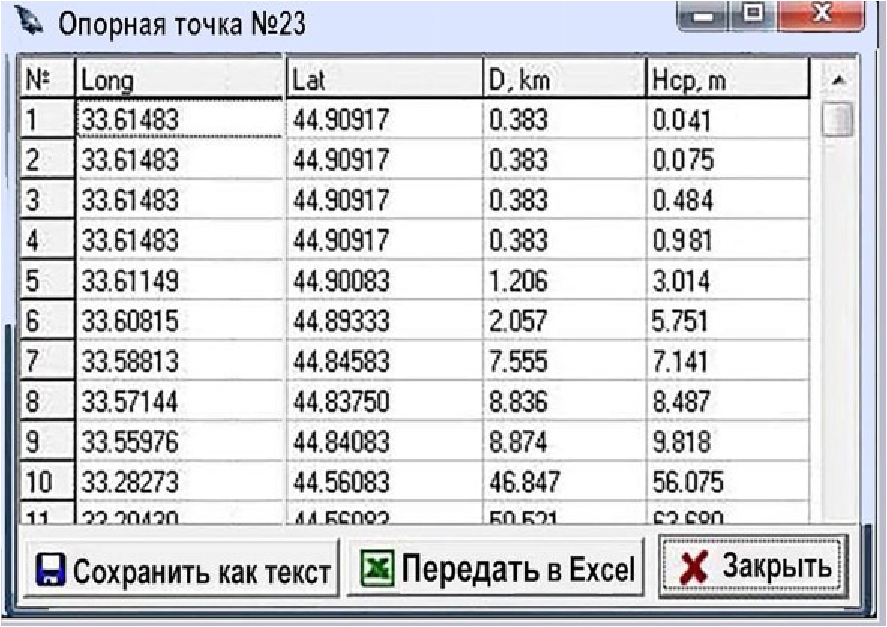 Together with the construction of rays along the drawn transversal lines, depth profiles corresponding to the loaded DEM grid are determined, from which, in turn, average values are calculated and displayed in the resulting table simultaneously with the coordinates of the end points of the acceleration rays (Fig. 3).