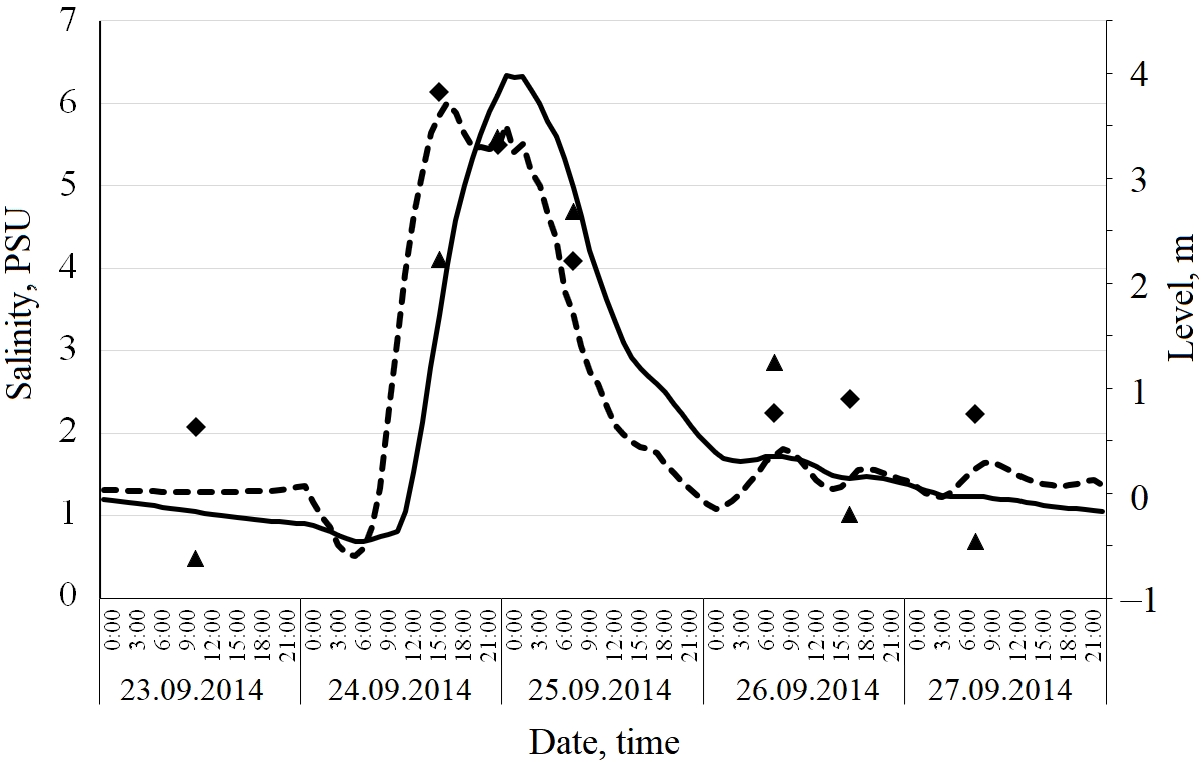 Fig. 2. Water salinity and water level in the water area of the port of Azov from 24 September 2014 to 27 September 2014. The triangles are observed concentration; the solid line is calculated concentration. The diamonds are the observed level; the dashed line is the calculated level