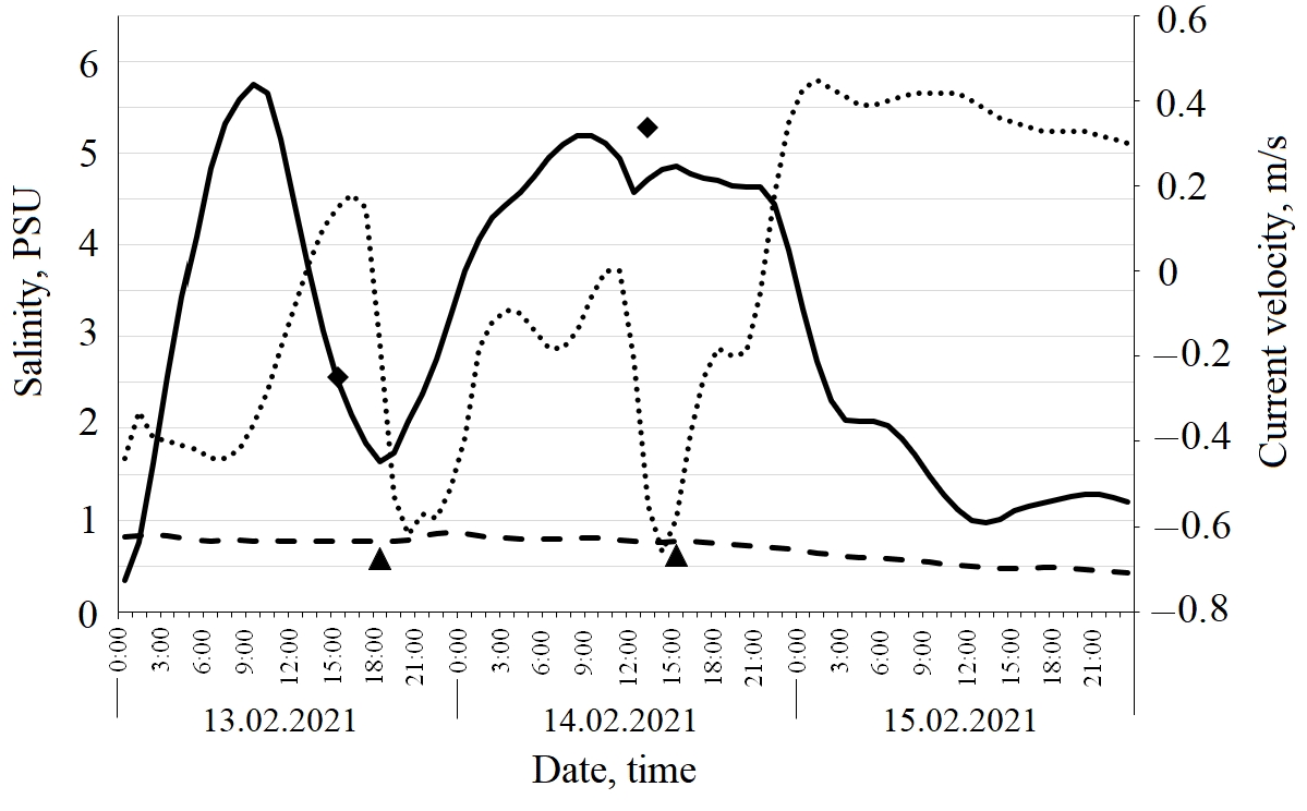 Fig. 3. Salinity and velocity of current in the area of the port of Azov from 13 February 2021 to 15 February 2021. The triangles are the Rostov beach (observed). The dashed line is the Rostov beach (calculated). The diamonds are the port of Azov (observed). The solid line is the port of Azov (calculated). The dotted line is the velocity of current (the port of Azov)