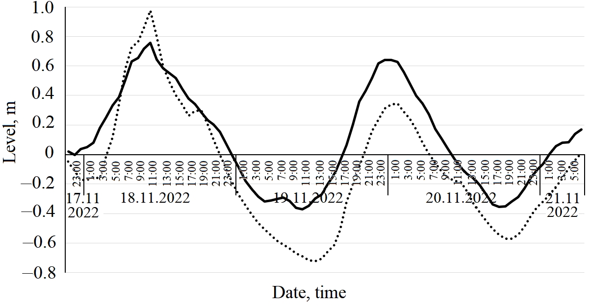 Fig. 5. Change in the water level at the hydrological station of Donskoy from 17 November 2022 to 21 November 2022. The dotted line is observations. The solid line is calculations