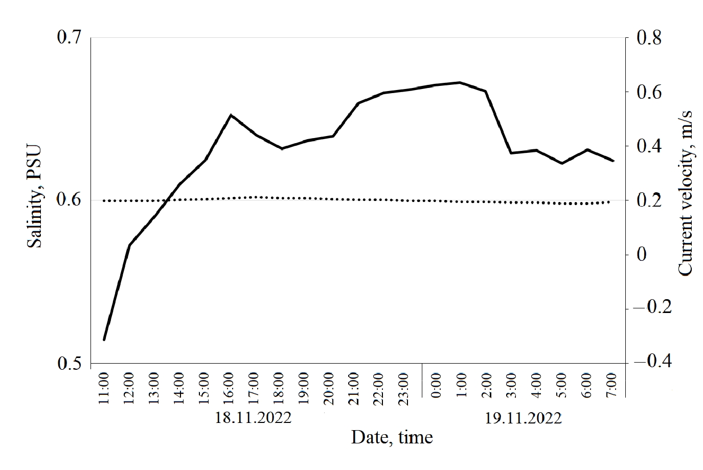 Fig. 9. The dependence of salinity on the velocity of current in the area of Kostina Yama from 18 November 2022 to 19 November 2022 (observed values). The dotted line is observed salinity. The solid line is observed velocity