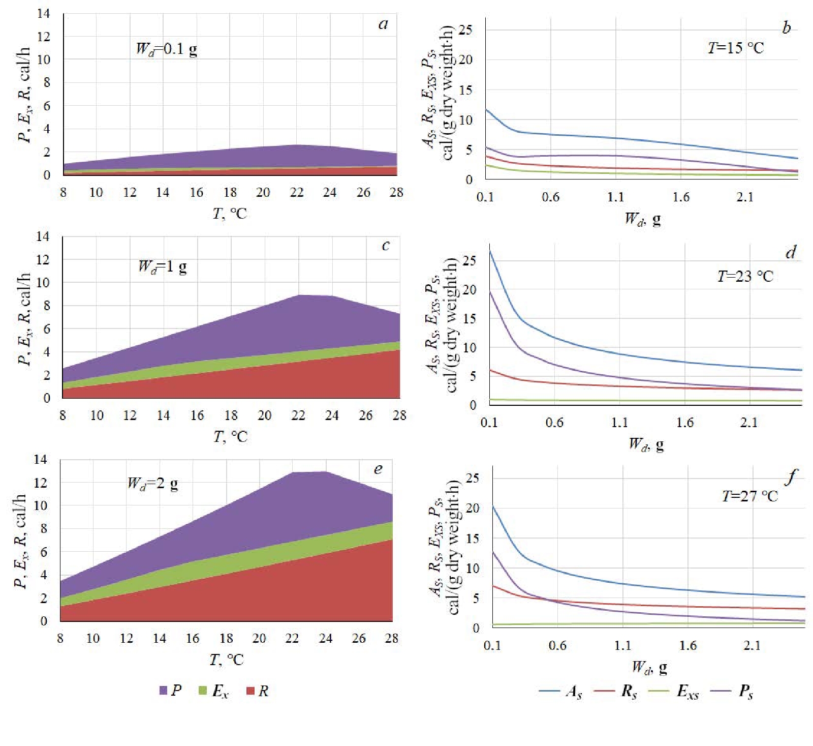Fig. 2. Dependence of the energy balance components on water temperature T (a, c, e) and oyster dry weight Wd (b, d, f). P – productive energy; Ex – excretion energy; R – respiration costs; A – assimilated energy. The S indices denote specific quantities